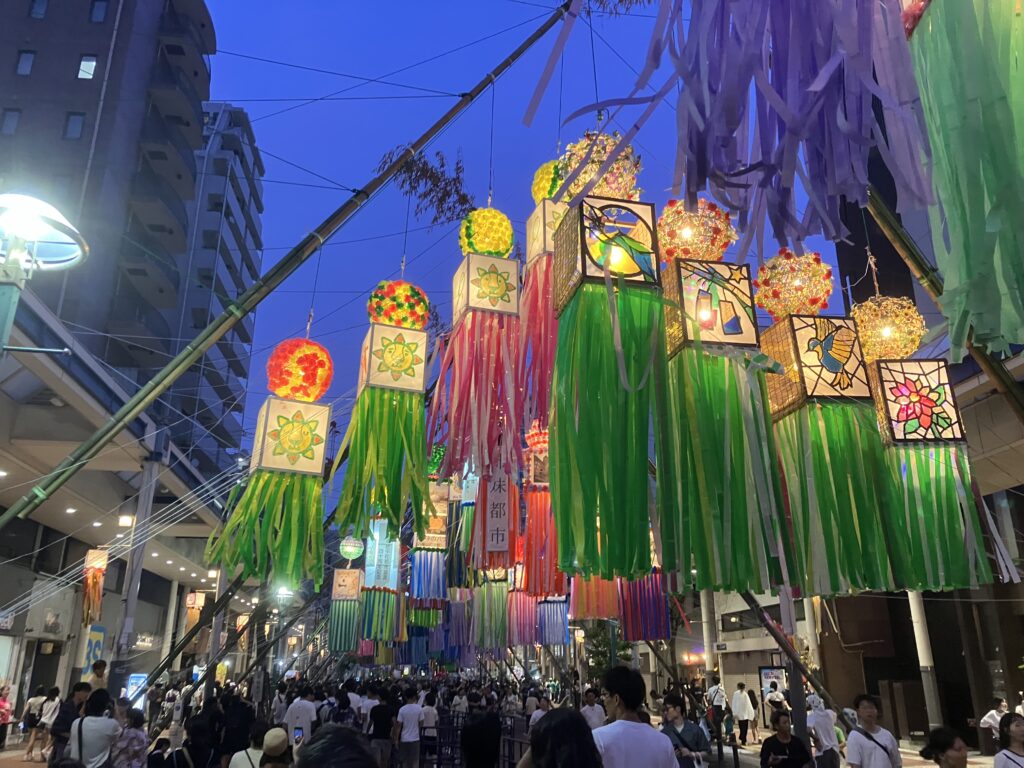 日が暮れてきたのでまた駅前の通りに。七夕飾りがライトアップされて綺麗でした。
