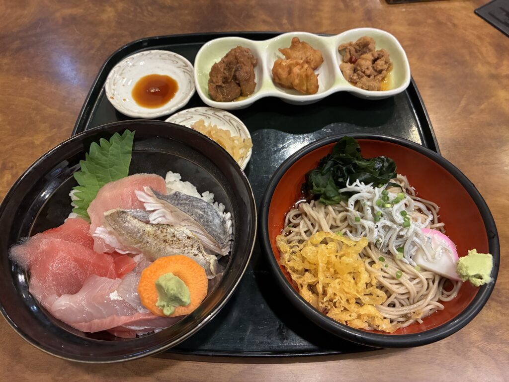 お昼は近隣のお店で海鮮丼としらす蕎麦のセットを頂きました。