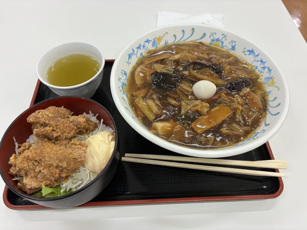 今回はボリューミーなあんかけラーメンと唐揚げ丼のセットを頼みました。