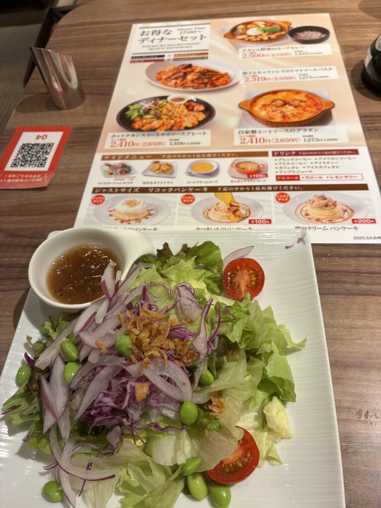 オーダーはディナーセットでグラタンとサラダ、さつまいものパンケーキをチョイスしました。